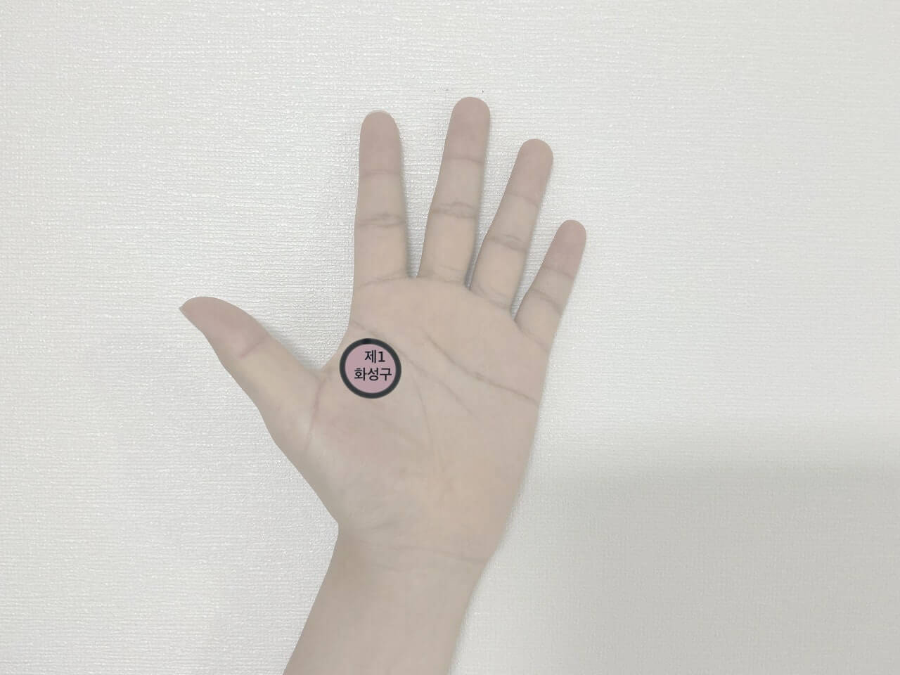 제1 화성구에 살이 붙어 있으면 행동력이 있고 승부에 강합니다. 여기에 살이 있고 탄력이 있으며 윤기가 나면 의욕이 있어 적극적으로 행동합니다. 경쟁에 지지 않는 강인함이 있으며 남들 앞에서 자신을 전부 드러내는 용기도 있습니다. 살집이 좋아도 탄력이 없을 때는 조바심이나 질투심으로 싸움을 일으키기 쉽습니다. 남을 궁지로 몰다가 결국 자신도 불행해질 수 있으니 마음을 다잡고 행동해야 합니다.