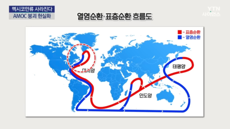 이 순환을 기온과 염분 때문에 생기는 순환이라는 뜻이 담긴 열염순환(熱鹽循環)이라 부르는데요. 그림에서 보시면 푸른색 해류가 차가운 열염순환이고 빨간색 해류가 표층순환입니다. 그런데 그린란드 인근에서 바닷물이 심해로 가라앉게 되면 멕시코 만류가 북극으로 올라와 보충해 주는 역할을 하게 되는데, 바로 이 난류를 대서양 자오선 역전순환류 영어로는 AMOC라고 부릅니다.